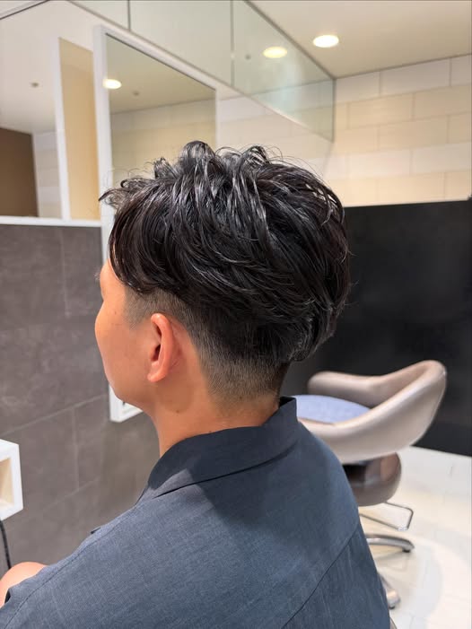 サイドから襟足にかけてスッキリ刈り上げることで、清潔感と男らしさを演出。トップは毛流れを生かした柔らかなパーマで、朝のスタイリングも簡単にキマります。