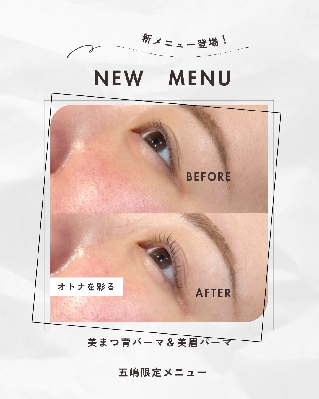 NEWメニュー『美まつ毛&美眉毛パーマ』 2025.08.05 Tweet Share ≪五嶋限定メニューになります≫ 五嶋限定メニューになります。 ご予約はこちらからでも可能です♪ Tweet Share メンズスカルプケア 年末年始休暇のお知らせ