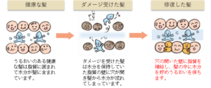 原因:パーマやカラーを繰り返して行う事でキューティクルがザラつき艶がなくなり保湿力が低下しうるおい不足。