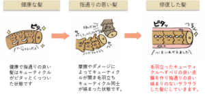 原因:キューティクルが剥がれたり浮き上がることでキューティクル同士が絡まり摩擦をおこしザラついてしまっている。