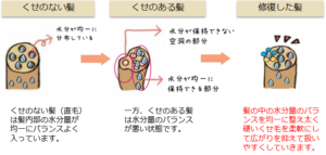 原因:くせ毛は場所によって髪の水分量や形状が不均一でパサつきまとまりにくくなるしまう。