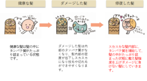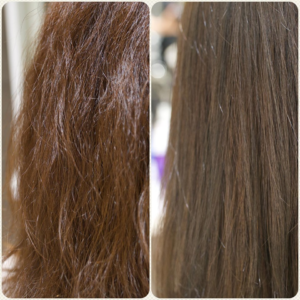 原因:過度なブラッシングエイジングによる髪質の変化、パーマやカラーにより髪芯部のタンパク密度が低下しスカスカゴワゴワな状態になってしまっている。