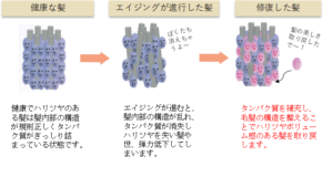 原因:年齢によりエイジングが進行し髪質が変化。ツヤがなくなり、髪やせ、弾力の低下によりボリュームが出にくくなってしまうのはタンパク質密度が不足しています。