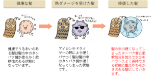 原因:毛髪内部をアイロンやドライヤーの熱変性により髪の柔軟性の低下し硬くなりパサつき乾燥している