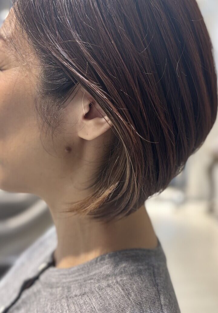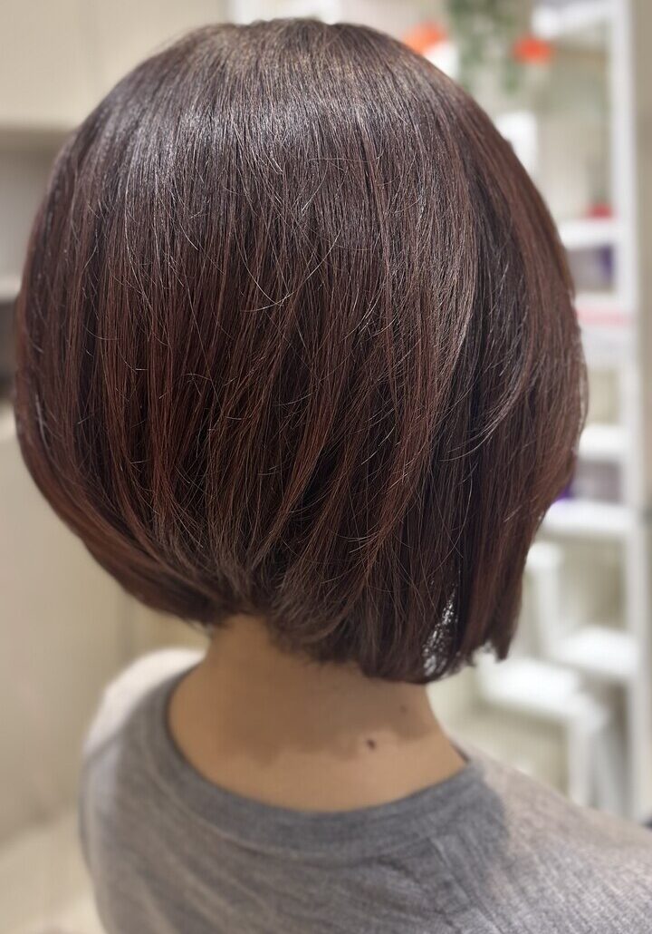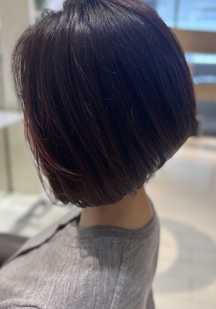 - 首元をすっきりと見せる上品な前下がりショートボブ。自然な丸みで女性らしさをキープしつつ、気になるボリュームも程よくコントロール。大人の横顔を洗練させる、360°どこから見ても好印象。上質な艶ピンクカラーで肌のトーンも明るく見えます♪