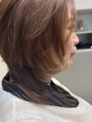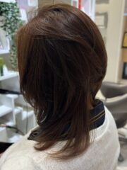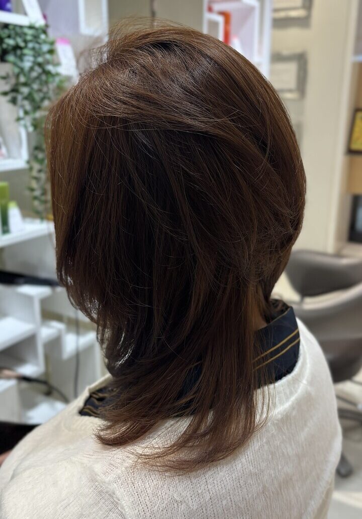 - トップがつぶれる、広がる、パサつく…そんな大人髪の悩みに。削りすぎないレイヤーで自然なふんわり感と首元のくびれを作り、若見えするシルエットへ。乾かすだけでまとまるデザインです。
