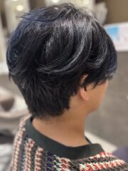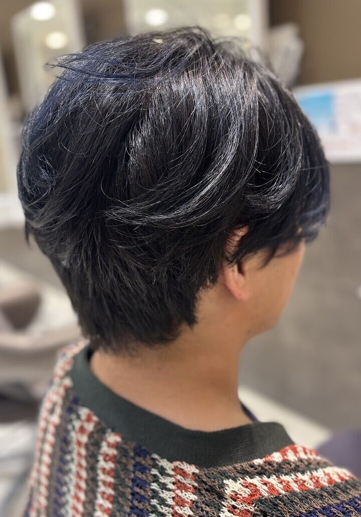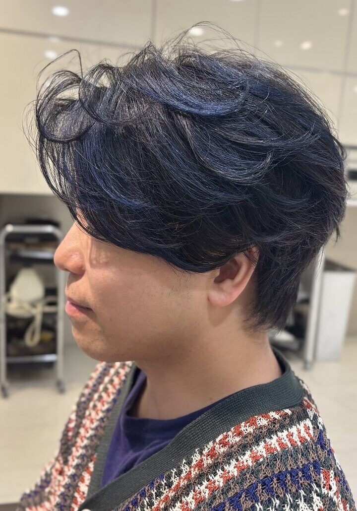 - 深みのあるネイビーカラーが魅力のメンズスタイル。動きを出したレイヤーと柔らかい束感で、ナチュラルなのにどこかモードな印象に。土台に細かいハイライトを入れることで光の当たり方でほんのりと青みが透け、上品さと個性を両立します。