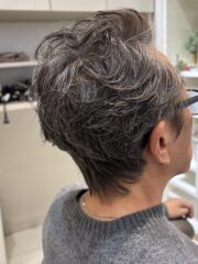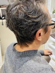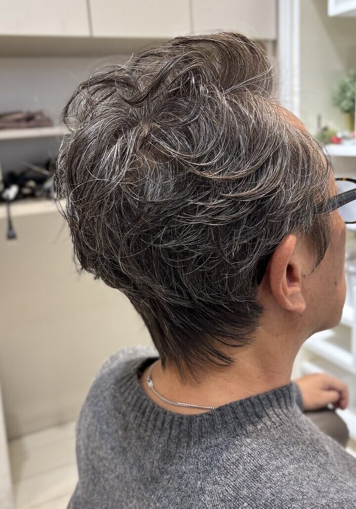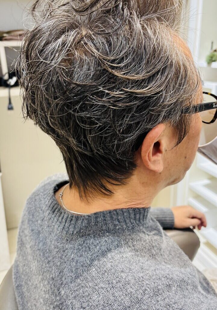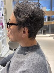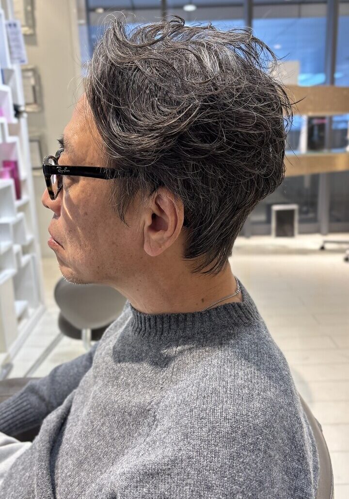 トップに程よいボリュームを与え、気になる髪のハリ不足や白髪も自然に馴染む大人のオールバックパーマ。動きと立ち上がりをつくることで若々しい印象に。忙しい朝もワックスでキマる上質スタイルです。