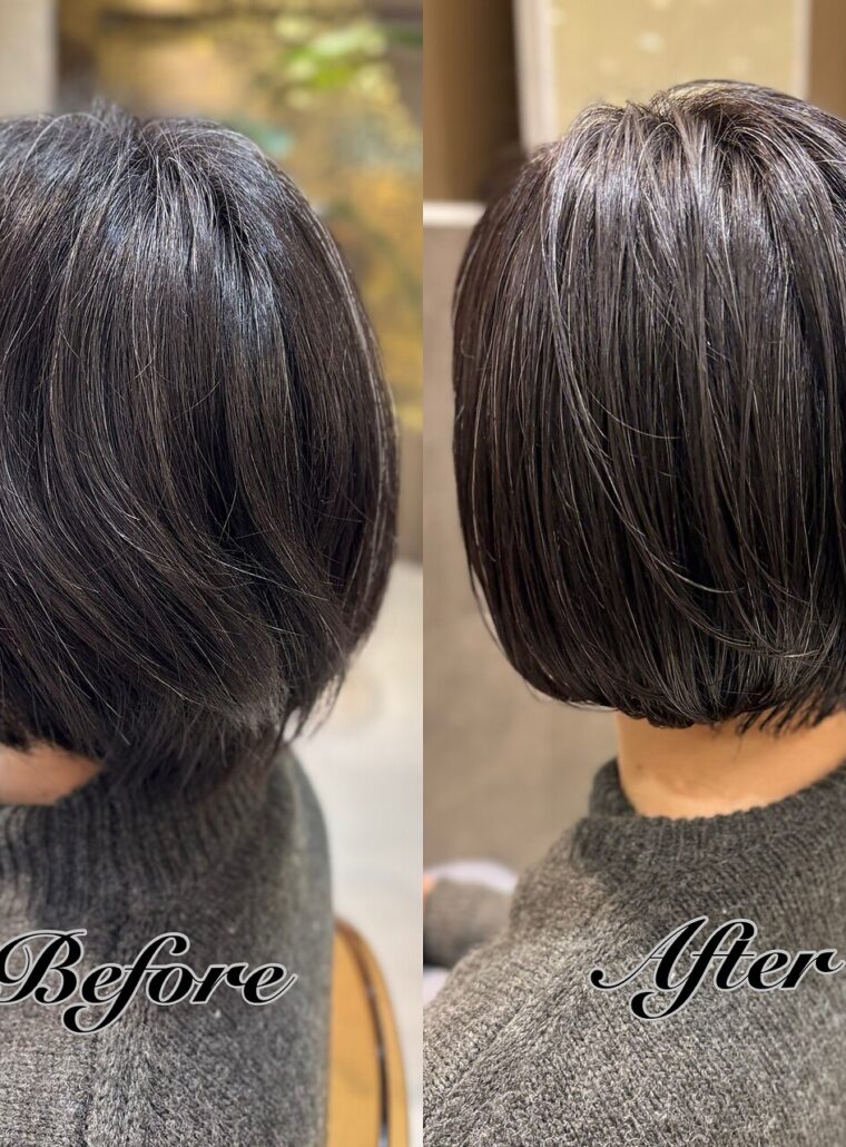 - 年齢と共に広がりやすくなる髪をまとまりやすいラインで整えたショートボブ。重さのバランスを調整することで乾かすだけでまとまる扱いやすいスタイルです。大人世代の「広がる・まとまらない」お悩みにおすすめです。